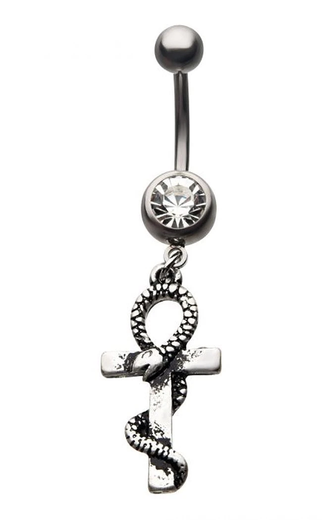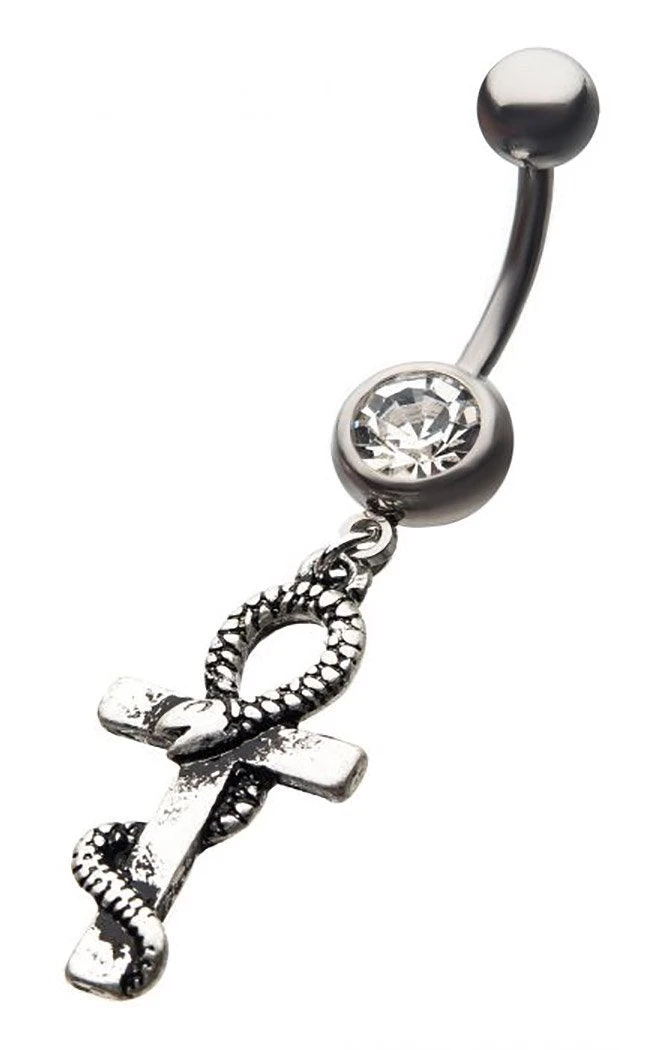 Cubic zirconia stone in the middle with a dangle charm of a snake forming an ankh. Sweet.Â