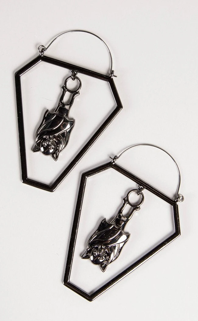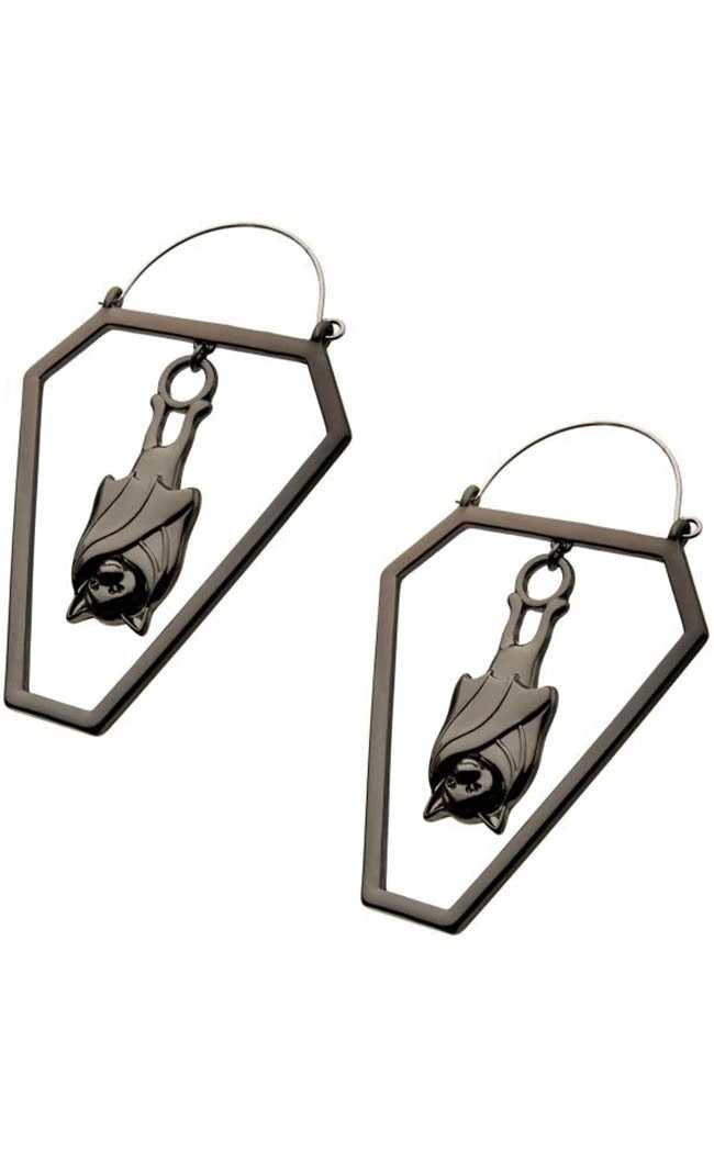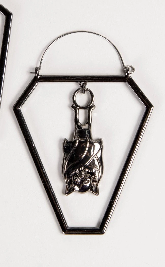 These two coffins are cast in shining black metal, two bats hanging sound asleep inside.
