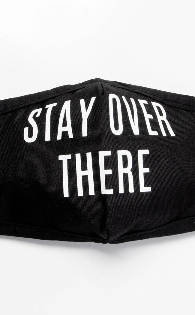 Stay at least 1.5 metres away or catch these hands! This simple statement facemask features the words “Stay Over There” on an all-black background. The soft fabric is comfortable for hours of wear every day and the ear loops have adjustable toggles to fit most adult faces.
