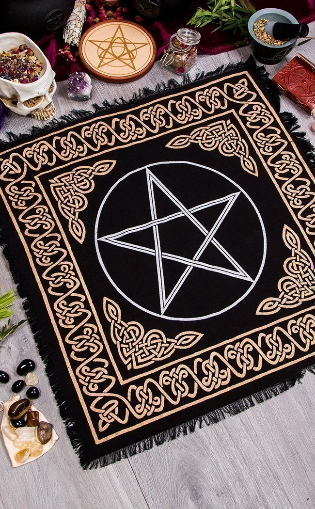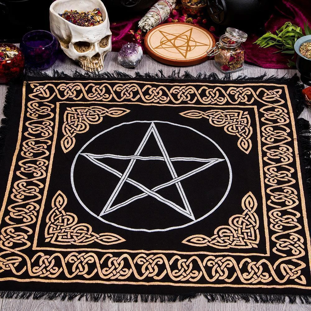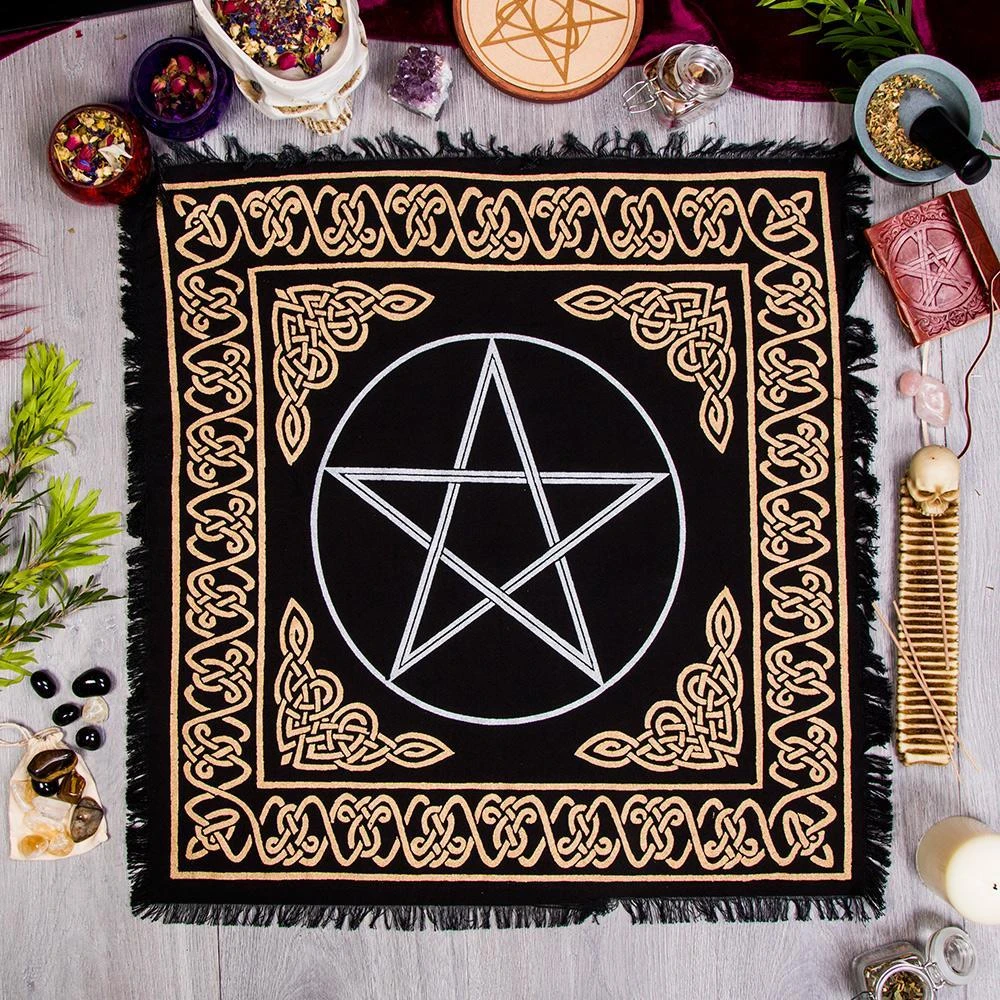 Stunning black and gold pentacle print altar cloth or tablecloth setting the perfect witchy vibe.