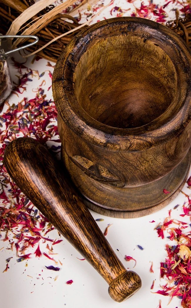 The careful preparation of herbs in a mortar is one of the most important things when creating herbs for cooking, healing and magic. It’s about the intention and dedication to what you are preparing. Concentrate on what you are doing, feel the aroma of freshly ground herbs, and allow their energy to flow through and around you.