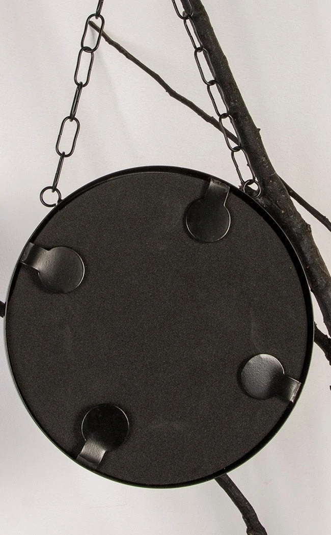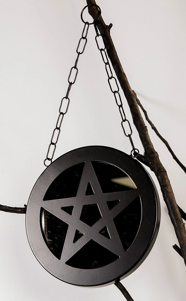 This gorgeous round mirror is enshrouded in matte, black metal, a pentagram crossing over the shining surface. This piece hangs from a bold, thick chain with a ring, making it easy to display around the home or above your altar.