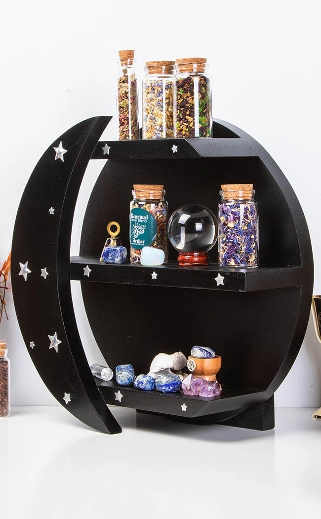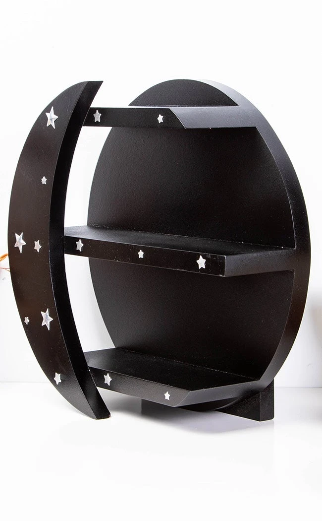Show off your trinkets and create your own constellation with the Cosmos Apothecary Shelf! Three shelves sit against a rounded backing, shadowed by a 3D crescent moon cutout. The shelves are decorated with silver stars and the entire piece is finished in sleek matte black.