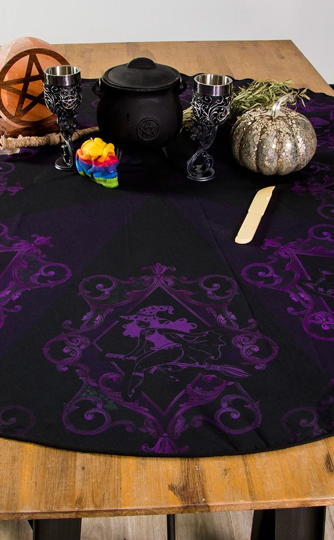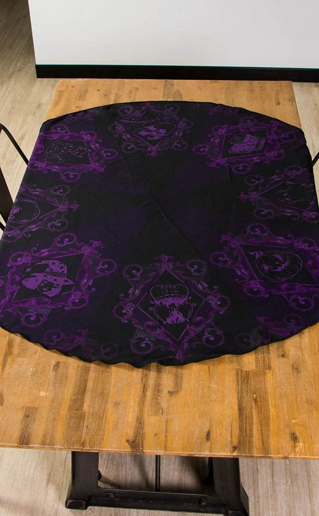Witchy purples swirl around this inky black tablecloth, forming artwork of horror holiday favourites like cats, Jack O’ Lanterns and cauldrons. Spread over your table to simultaneously brighten and darken your dining room and get everyone hungry for a wicked holiday feast!