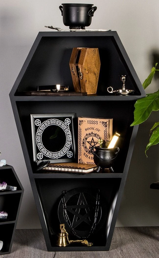 Wicked black coffin-shaped shelf. These babies are 75 cm high and perfect for displaying books, curios, or basically anything you like.Â