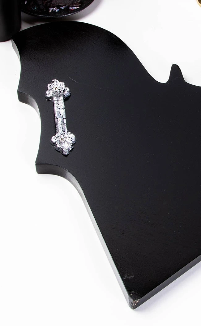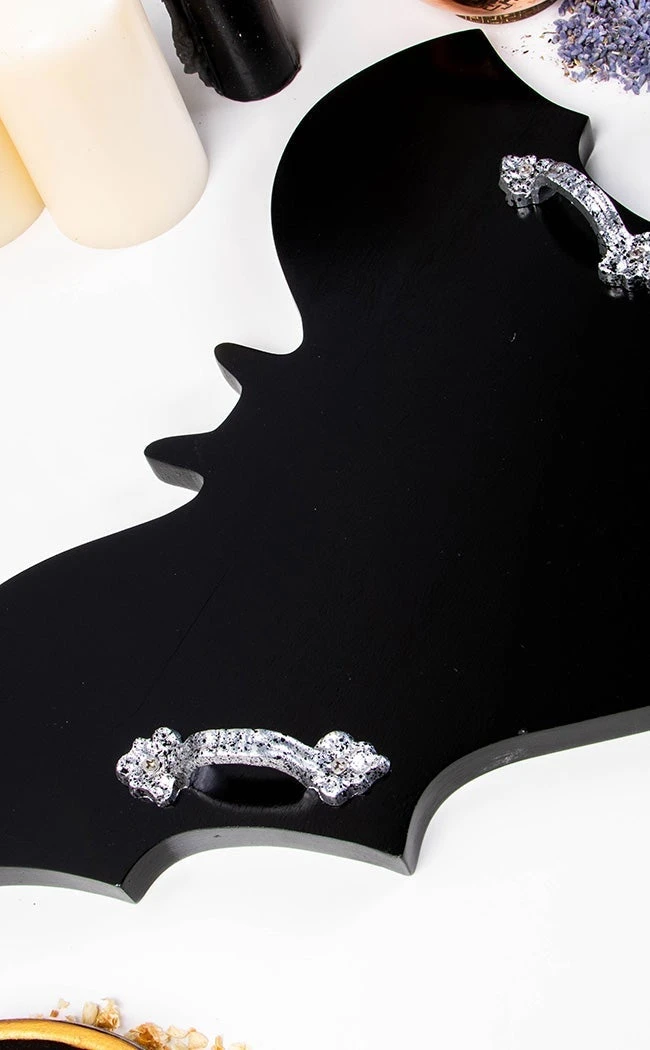 Unleash a vampiric feast upon your guests with the Nocturnal Serving Tray! Made with hardy mango wood, these trays are finished in sleek black and shaped after a screeching bat caught mid-flight. With two antique look handles, these versatile statement pieces are perfect for serving charcuterie, drinks and snacks at your next dinner party or creating a uniquely dark centrepiece for your dining table.