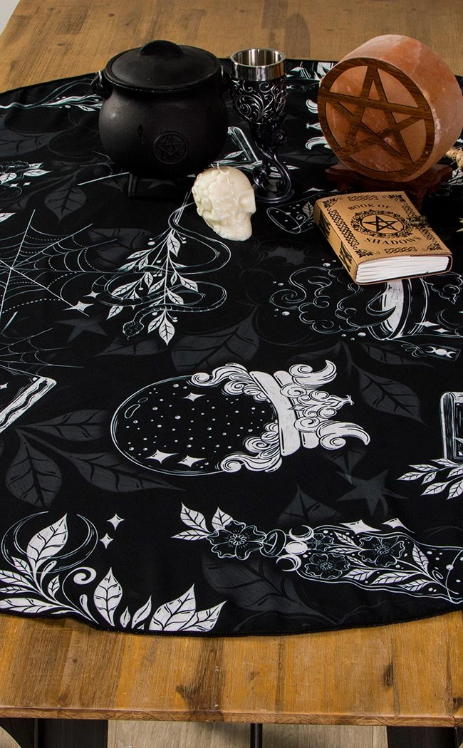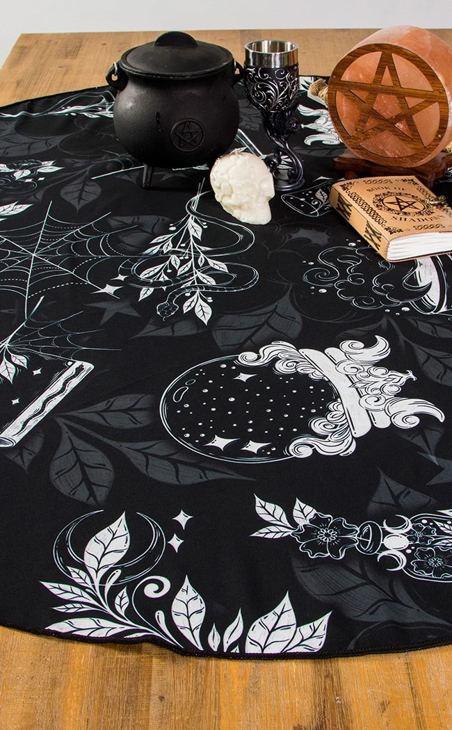 This intricate tablecloth is humming with wild energy and witchy symbols set against a monochrome backdrop of overgrown leaves and ivy.  The fabric is hardy enough to withstand all messy gatherings and midnight snacks, wiping clean with ease.