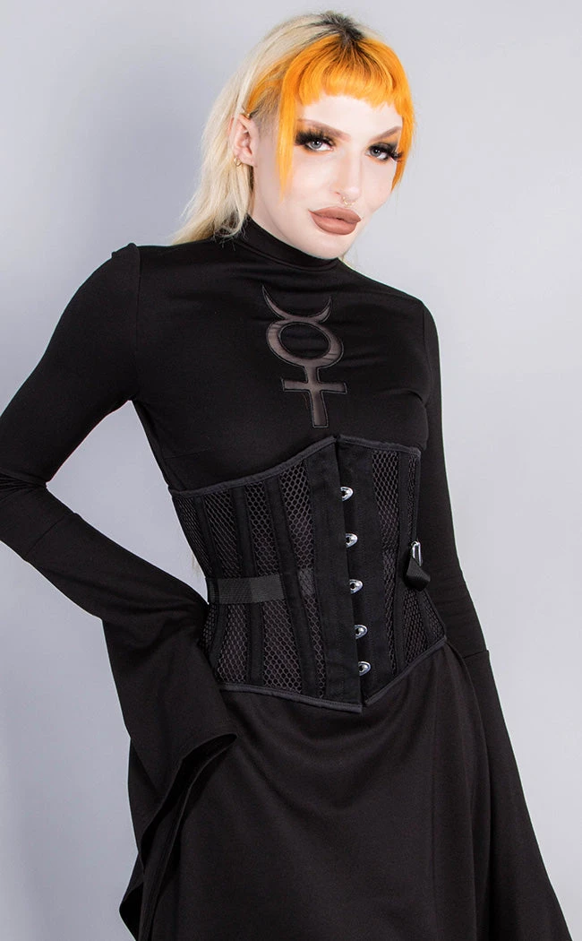 Show some skin in the Bad Faith Net Corset! This steel boned underbust corset features panels of durable netting along with an adjustable buckle that snakes around the waist.  The back of the corset comes with a modesty panel behind the lacing that can be folded away according to your wear preference.