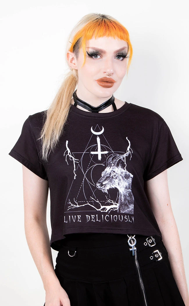Party hard with everyone’s favourite goat/devil in the Black Phillip Crop Tee! Made with super soft fabric, this crop features stunning occult artwork of a goat and the words “Live Deliciously” in a metal font as well as the Tragic Beautiful logo on the back. This crop is cut to the perfect length, sitting at your natural waistline and stretches with you for a comfortable, flattering fit.