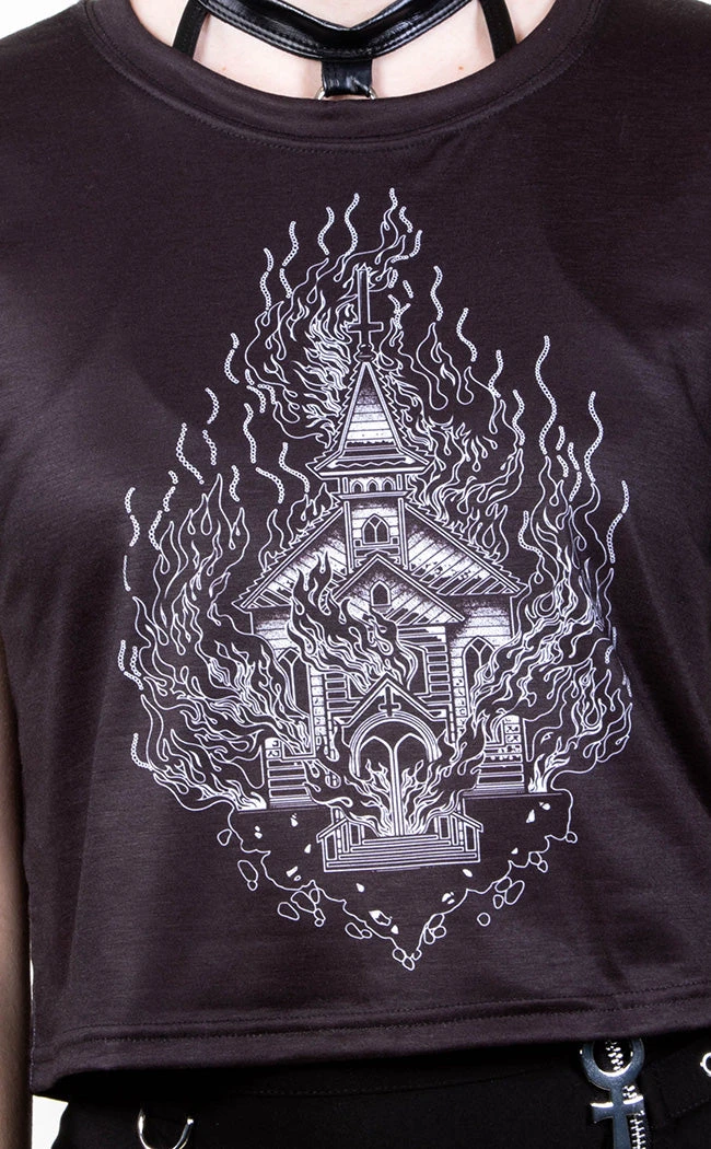 Dance in the hell flames with the Holy Smokes Crop Tee! Get comfy creepy in super soft fabric as black as your soul, printed with wicked artwork of a burning church as well as the Tragic Beautiful logo on the back. This crop is cut to the perfect length, sitting at your natural waistline and stretches with you for a comfortable, flattering fit.