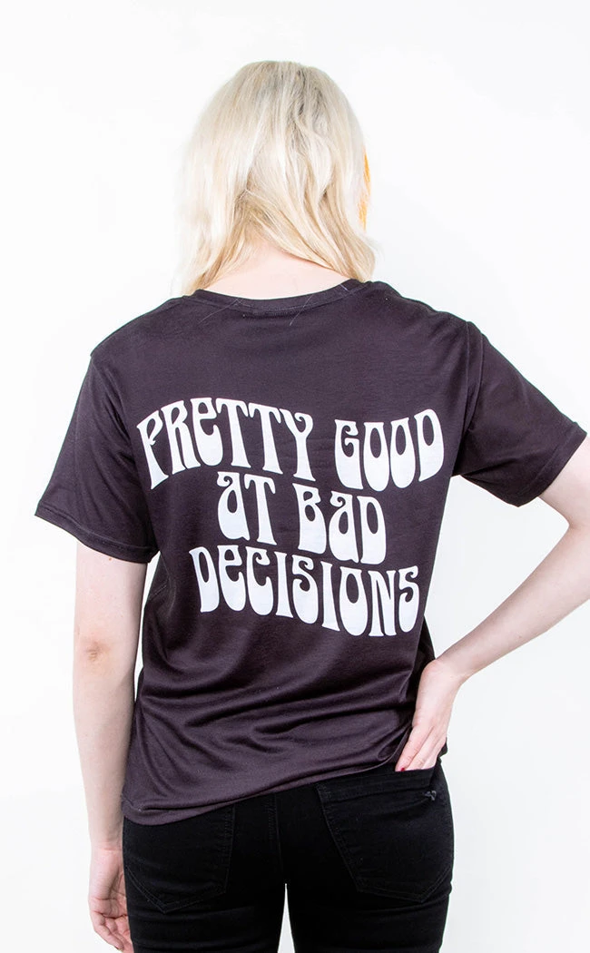 Show off yer skillset in the Pretty Good at Bad Decisions Tee! Slip into soft stretchy fabric as black as yer soul, featuring the phrase “Pretty good at bad decisions” in warped font on the front breast and in a large, statement print on the back.