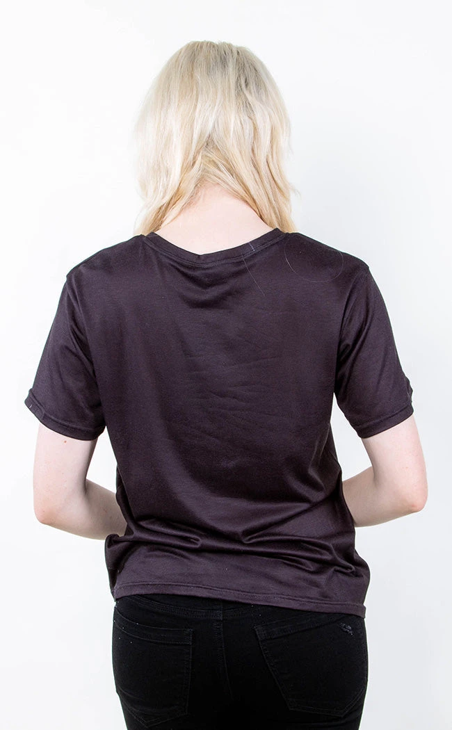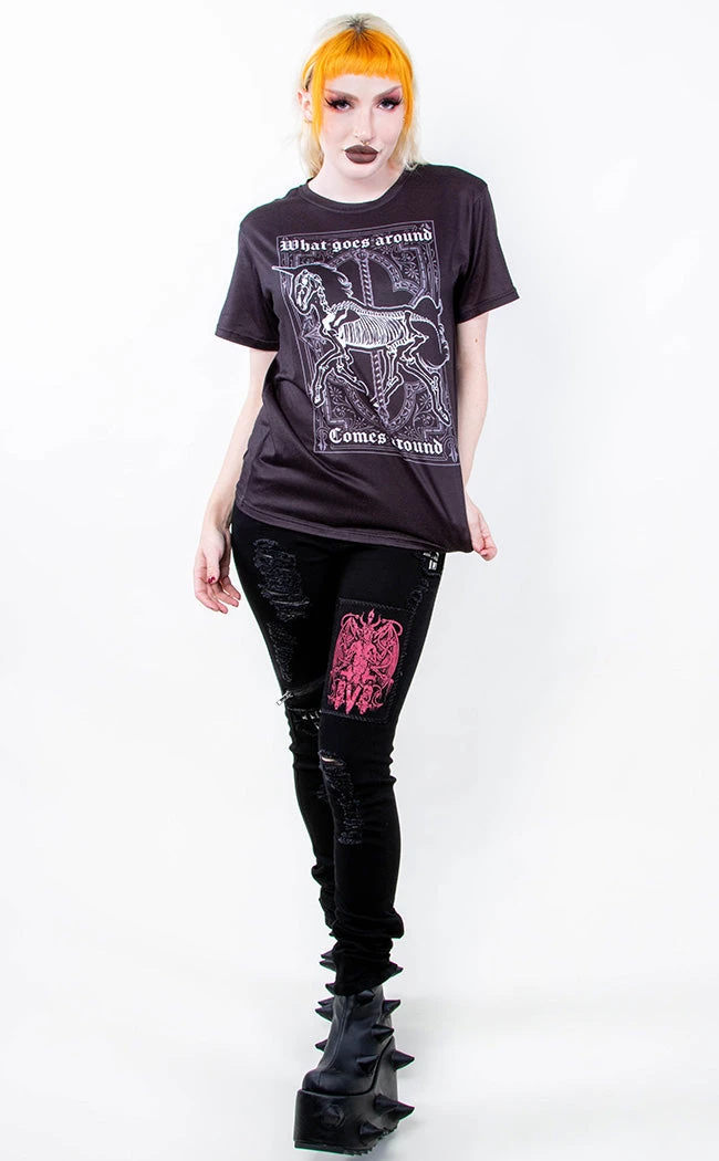 Give them what’s coming to ’em in the What Goes Around Tee! Slip into soft stretchy fabric as black as yer soul, printed with an undead carousel pony and the words “What goes around comes around”.