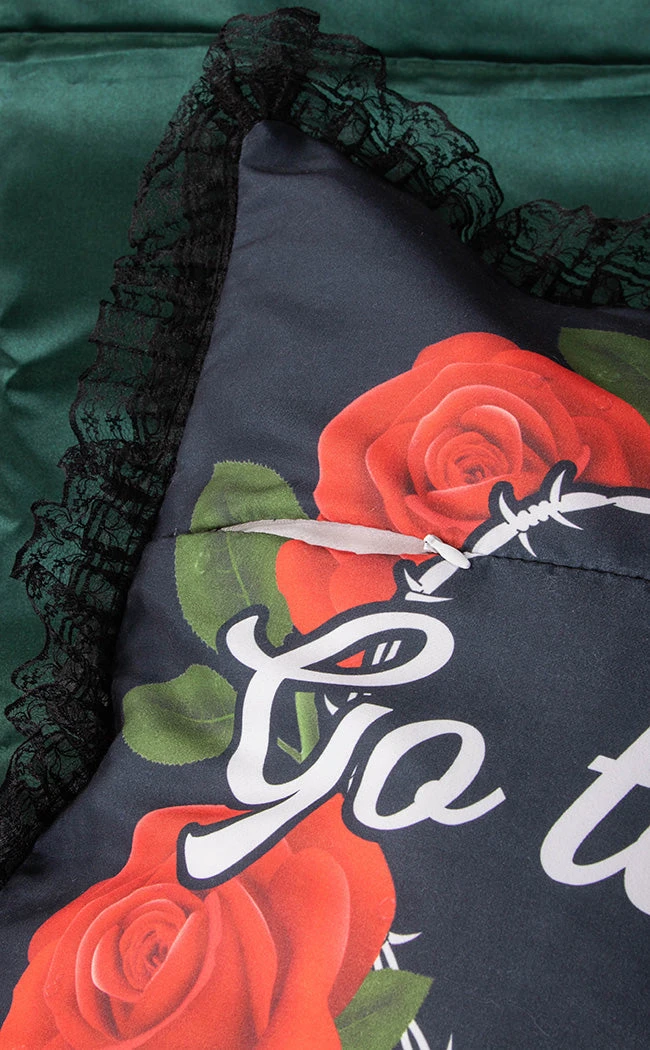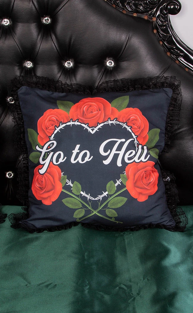This cheeky cushion slip features the words “Go To Hell” bordered by a barbed wire heart and surrounded by lush, red roses. The fabric is super soft and finished with a delicate lace trim.