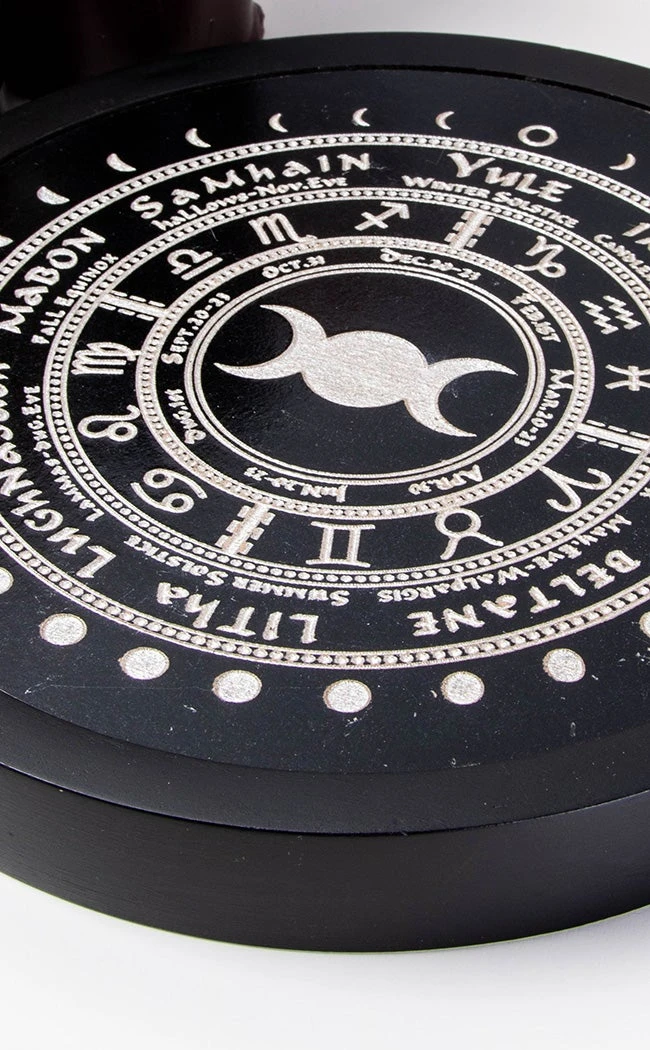 Made with hardy mango wood, this plaque features every major date in the Pagan calendar. Details are etched in silver over contrasting black, including a moon phase border and a triple moon centrepiece.