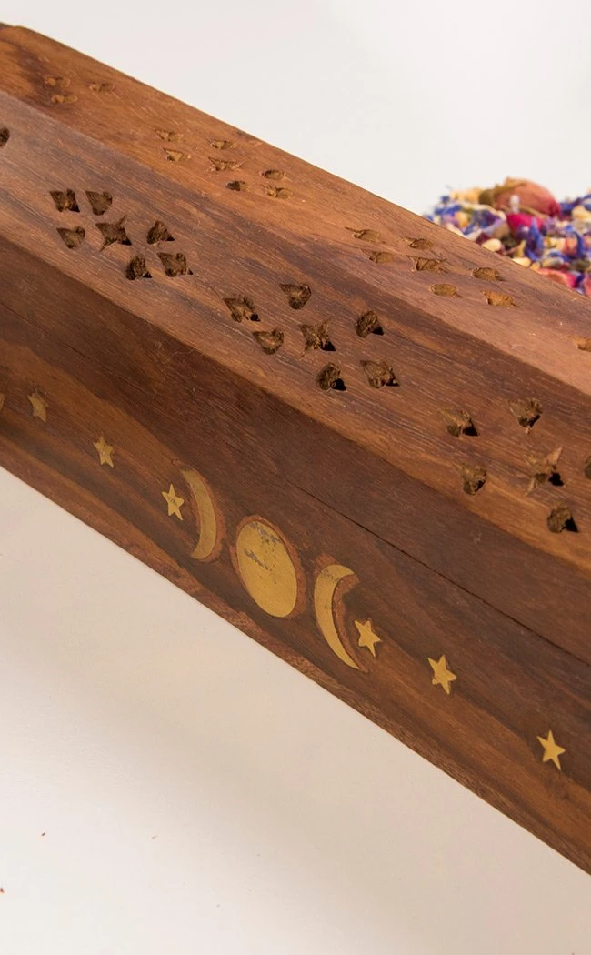 Store and burn your incense with this beautiful holder! Both the front and back of this holder feature triple moon symbol inlays.
