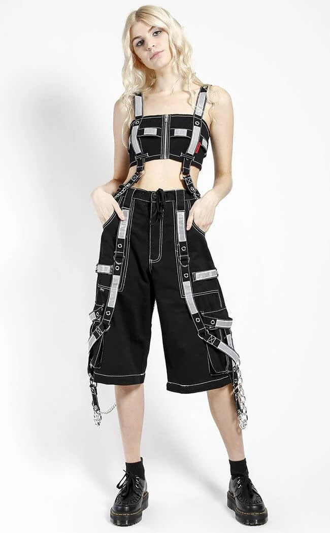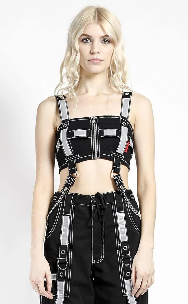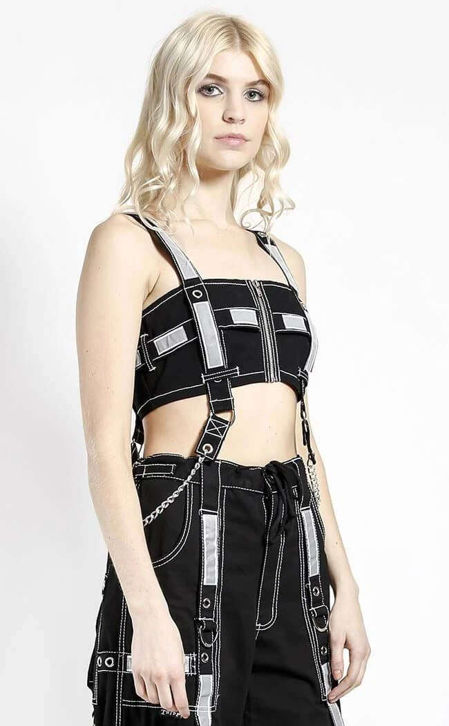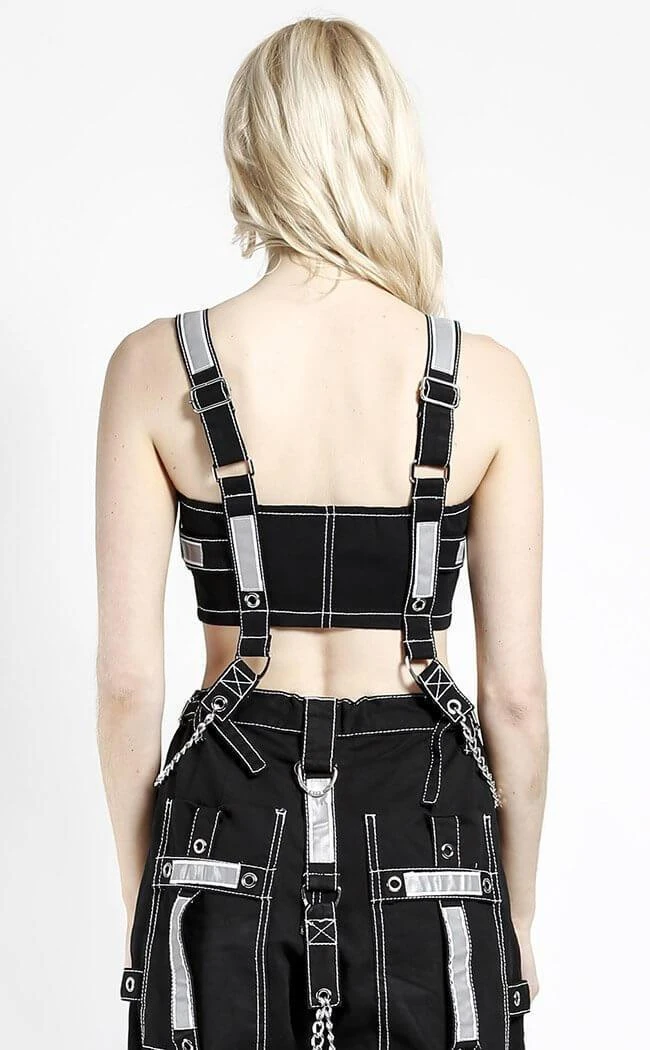 Glow under blacklight and blind the floor.  Reflective panels cut into pitch black on straps and the chest while detachable chains hang from the sides. Pair with yer fave bondage pants and crazy platforms.